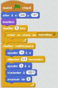 Une solution plus complexe est d’utiliser le bloc « créer un clône », en modifiant le script principal de l’alien comme ci-dessous :