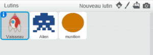 Répéter cette étape pour ajouter aussi un alien et une munition. Cliquer sur le I bleu de chaque lutin pour les renommer en « vaisseau », « alien » et « munition ».