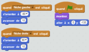 Explication du code : quand le jeu commence (le drapeau vert est cliqué), le vaisseau apparaît (« montrer ») et prend sa position de départ. Quand la flèche droite est appuyée, le vaisseau va s’orienter à droite (90°) et avancer (10 pas). Quand la flèche gauche est appuyée, le vaisseau va s’orienter à gauche (-90°) et avancer (10 pas).