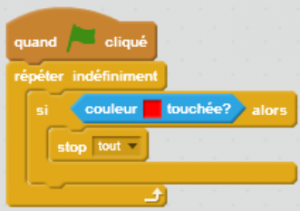 Explication du code : quand le jeu commence (quand le drapeau vert est cliqué), l’alien vérifie en permanence (« répéter indéfiniment ») s’il touche du rouge. Si oui, alors le jeu s’arrête (« stop tout »). Comme nous avons mis une barre rouge en bas du décor, le jeu se terminera donc quand l’alien sera arrivé tout en bas.