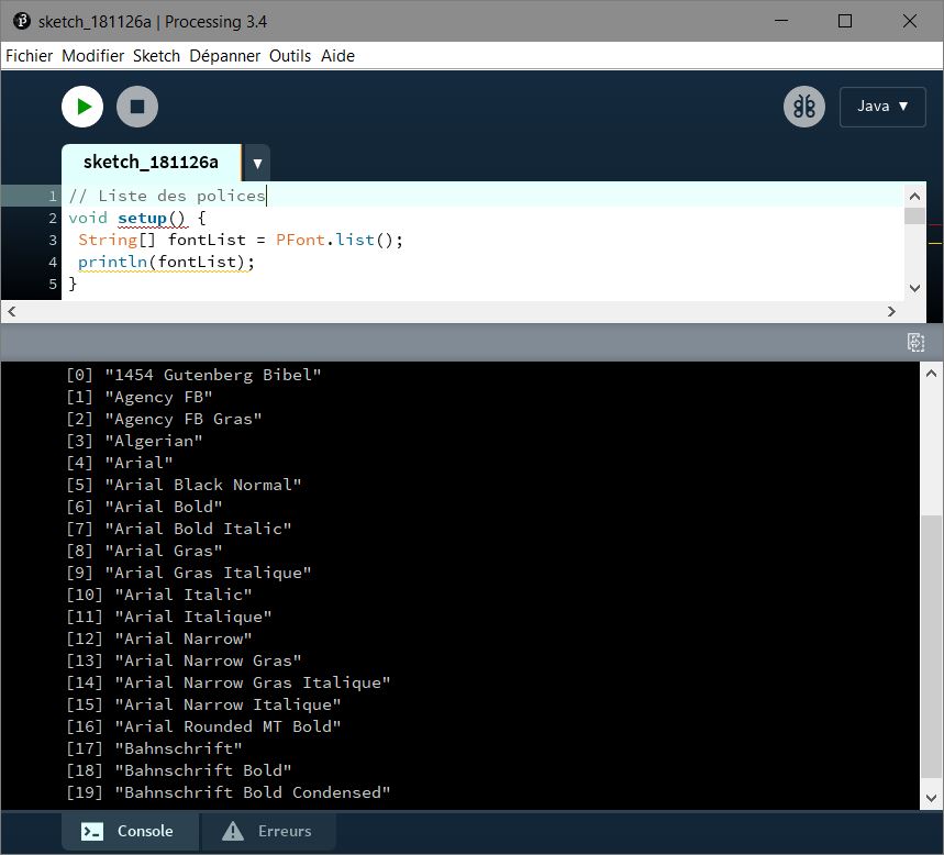 // Liste des polices void setup() { String[] fontList = PFont.list(); println(fontList); }