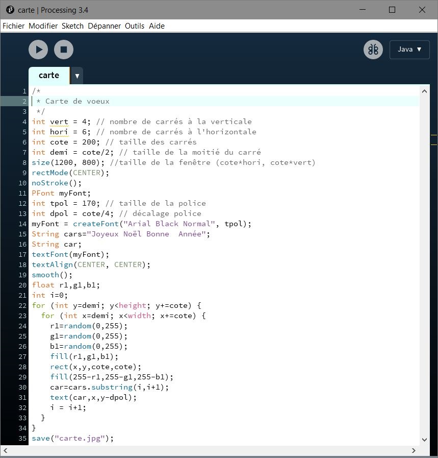 for (int y=demi; y<height; y+=cote) { for (int x=demi; x<width; x+=cote) { r1=random(0,255); // valeur de la composante rouge g1=random(0,255); // valeur de la composante verte b1=random(0,255); // valeur de la composante bleue fill(r1,g1,b1); // couleur du carré rect(x,y,cote,cote); // dessin du carré fill(255-r1,255-g1,255-b1); // couleur du texte (calcul de la complémentaire) car = cars.substring(i,i+1); // extraction du caractère d'index i text(car,x,y-dpol); // dessin du caractère i = i+1; // incrémentation de l'index } }