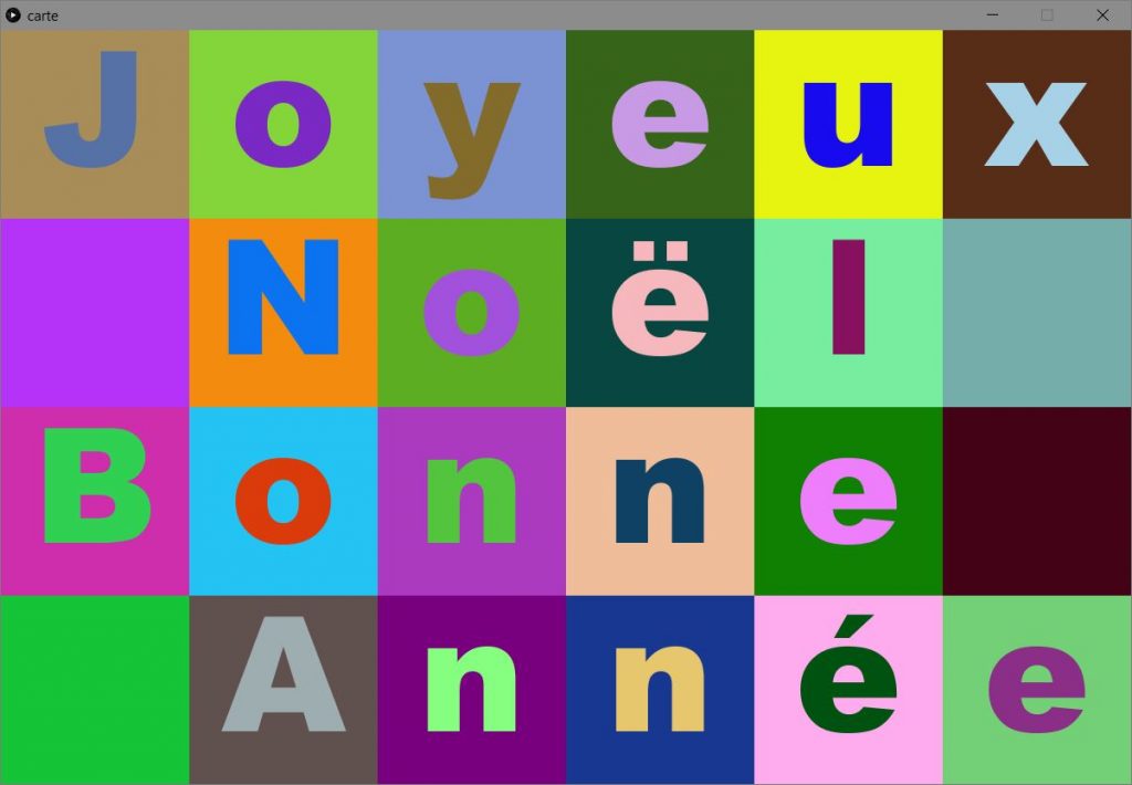 Le programme permet de construire une grille de carrés de 4 par 6 dont la couleur est fixée aléatoirement. Dans chaque carré une lettre est dessinée dans la couleur complémentaire.